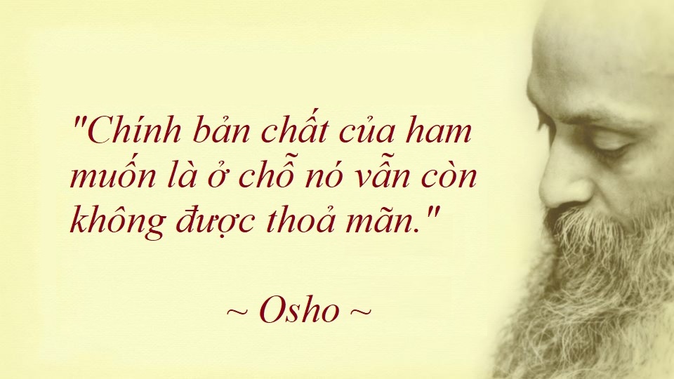 Mọi người bị bất hạnh, không thoải mái – không phải vì chính trong bản tính của sống là bất hạnh nhưng bởi vì chúng ta không biết nghệ thuật về là hạnh phúc, ở trong trạng thái thoải mái. Chúng ta biết nghệ thuật làm cho bản thân chúng ta bất hạnh, không thoải mái – tới mức độ không thể tưởng tượng được. Chúng ta tìm kiếm khổ. Người có ham muốn về tương lai, và mọi ham muốn đều là về tương lai, nhất định rơi thành con mồi của bất hạnh vì tương lai không bao giờ tới, nó chỉ dường như đang tới. Cái thực tại tới là hiện tại; cái không bao giờ tới là tương lai. Không thành vấn đề cái gì bạn làm, cái bạn có được là là hiện tại. Và nếu tâm trí bạn ở trong thói quen sống trong tương lai, thế thì hôm nay bạn sẽ sống trong tương lai, ngày mai nữa, và ngày kia cũng thế. Bất kì ngày nào tới, bạn sẽ ở trong tương lai. Và làm sao bạn có thể có điều bạn muốn trong tương lai? Nếu tương lai không bao giờ tới, khi nào ao ước tương lai của bạn sẽ được hoàn thành? Kết quả sẽ là bất hạnh. Đó là lí do tại sao kết quả của ham muốn bao giờ cũng là bất hạnh. Sống không phải là bất hạnh, ham muốn là bất hạnh. Ham muốn càng có đấy, khổ càng có đấy. Nếu bạn rất bất hạnh, đừng nghĩ đó là vì sự tồn tại giận bạn. Nếu bạn rất bất hạnh điều đó chỉ chỉ ra rằng bạn đầy ham muốn. Và khi những ham muốn đó vẫn còn không được đáp ứng, thế thì vết thương của bất hạnh tăng trưởng trong lòng bạn.
